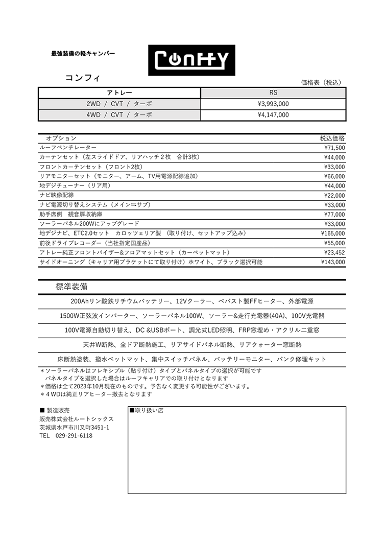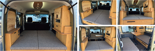 | 標準装備 | 200Ahリン酸鉄リチウムイオンバッテリー、12Vクーラー、べバスト製FFヒーター、1000Wインバーター、ソーラーパネル、ソーラー&走行充電器、外部電源、バッテリー充電器、100V電源自動切り替え、バッテリーモニター、DCソケット、USBポート、LED照明、収納棚、天井断熱、運転席助手席ドア断熱、スライドドア断熱、リアサイドパネル断熱、リアクォーター窓断熱、リアハッチ断熱、床断熱塗装、撥水ベットマット、集中スイッチパネル、オリジナル強化サス(リア) |