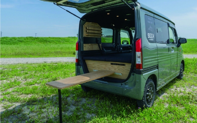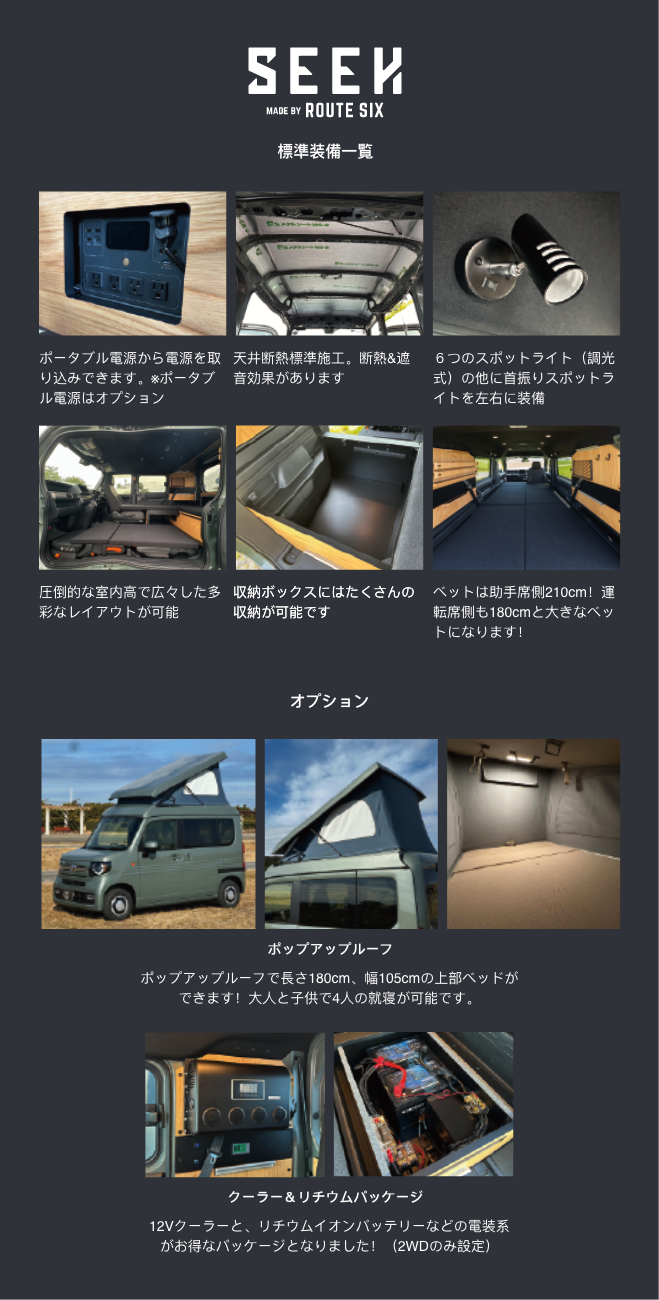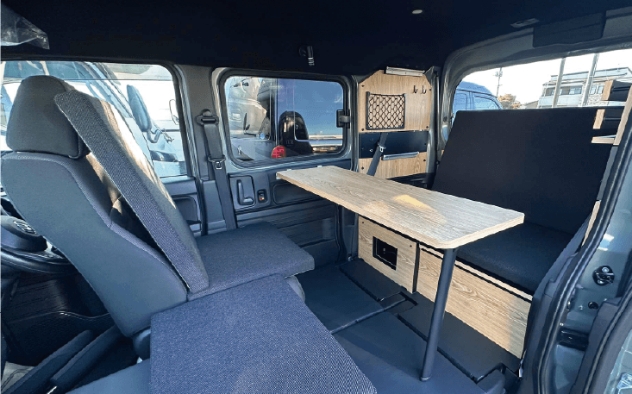 | 標準装備 | 天井断熱処理、LEDスポットライト照明×6(調光式)、首振りライト×2、マルチウェイロングテーブル、 収納棚、収納ボックス、吊り下げフック、収納ネット、ポータブル電源取り込みシステム、運転席回転シート |